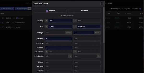 在Dexscreener上找到项目的关键是"设置筛选条件"。