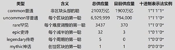 根据将十进制表示法所涵盖的四大基本事件排列组合,可以很明确的定义聪的六大稀有度,即普通、非普通、罕见、史诗、传奇、神话。