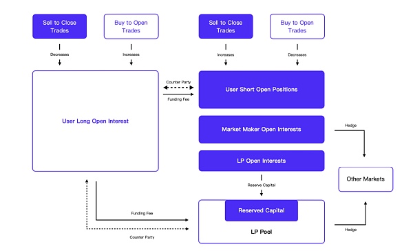 在传统去中心化交易平台,LP 直接承担多空双方的对手风险,并且每笔交易都占用一定的流动性,而 MPM 机制下,LP 将作为短时被动交易头寸,当系统匹配多空交易者后,将快速释放敞口,使 LP 的资本效率在理想状态下可无限放大: