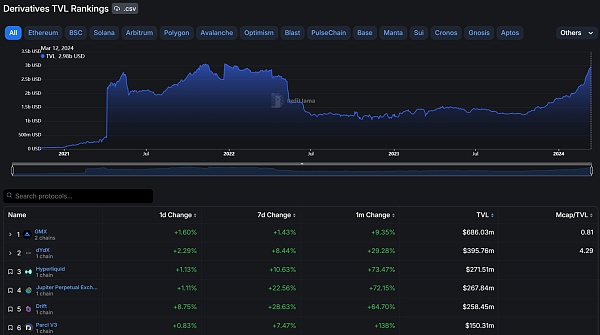 与此同时,目前赛道内处于头部位置的 GMX、dYdX 等链上衍生品协议的发展更是远远没有跟上,DeFiLlama 统计数据显示,截至 2024 年 3 月 12 日,全网 DeFi 总规模已超 1000 亿美元,但衍生品协议们的总体量尚不足 300 亿美元,占比不到 30%。