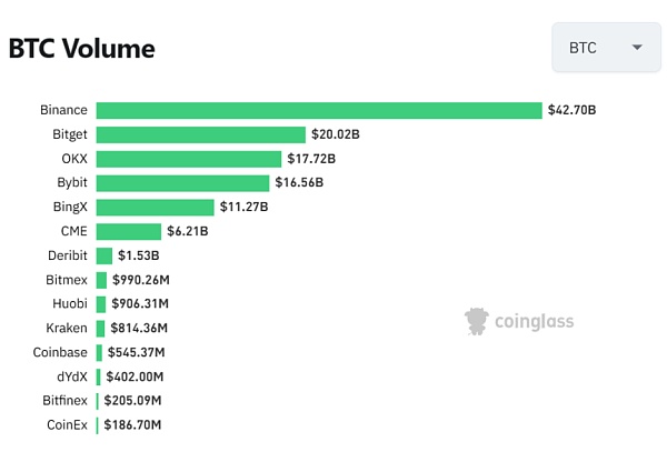 早在 2020 年,CEX 以合约期货为代表的衍生品交易就开始取代现货交易,逐步成为主导市场。Coinglass 数据显示,过去 24 小时,前五大 CEX 合约期货日交易量仅 BTC 一项就均已经达到百亿美元级别,头部的币安更是突破 420 亿美元。