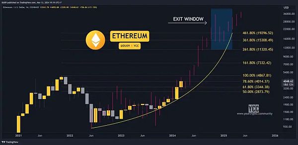 使用上一次牛市的情况对以太坊进行类似的预测,显示我们的退出窗口似乎也是相当准确的。有趣的是,它还显示以太坊可能会远远超过20,000美元。这是一个乐观的情况,但如果今年批准了以太坊ETF,这可能会变成现实。