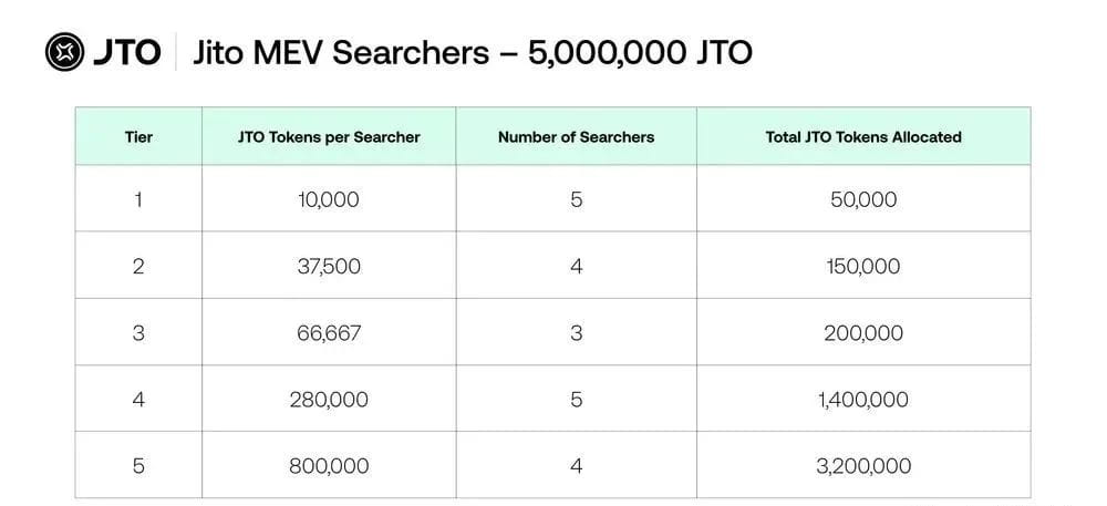 最后一批有资格获得 JTO 空投的对象为曾使用过 Jito MEV 搜索套件的搜索者,该部分的空投总额为 500 万枚 JTO 代币。