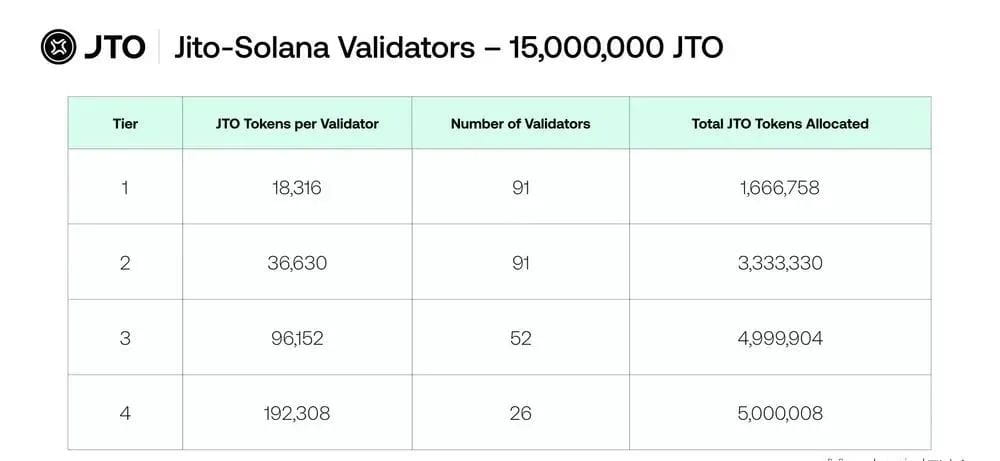 总计 1500 万枚 JTO 将依照以下规则分配给 Jito-Solana 验证者: