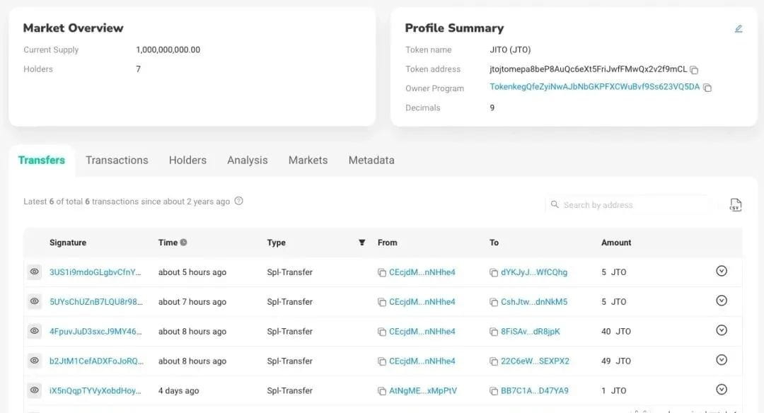 根据 Jito 今日早间公布的信息,JTO 代币现已于链上铸造,但当前除了一些小规模的测试性转账之外并未正式流通,代币合约地址为 jtojtomepa8beP8AuQc6eXt5FriJwfFMwQx2v2f9mCL。