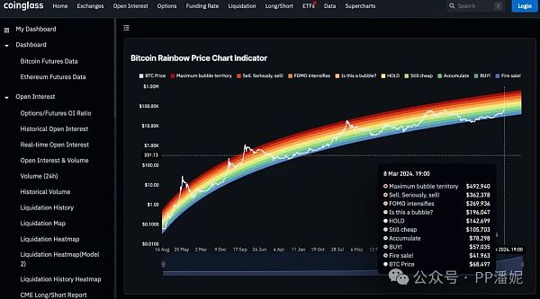 该平台因其关于加密货币衍生品的全面数据而脱颖而出,例如期货交易量、未平仓合约(这两项数据经常被用来识别市场的恐惧或贪婪),以及非常有用的比特币彩虹图(BitcoinRainbowChart)。