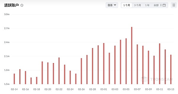 区块链浏览器TRONSCAN数据显示,波场TRON近一个月的日均活跃账户数超200万,增长显著。3月6日,波场TRON单日活跃账户数达272万,创2024年以来新高。