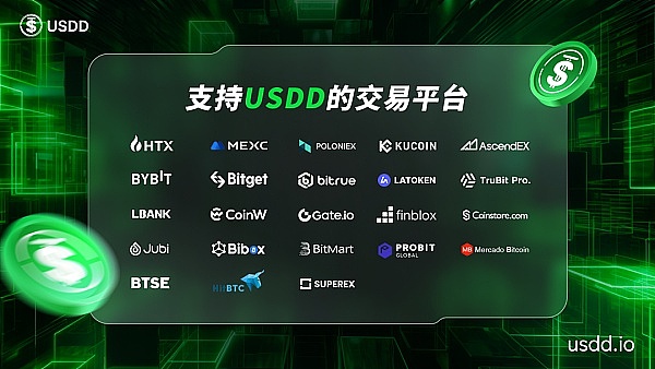 得益于生态的蓬勃发展,USDD已上线包括HTX、Poloniex、Bittrex等在内的23家交易平台。