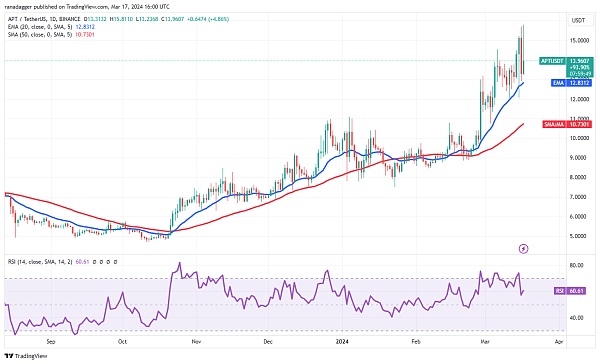 Aptos (APT)从 3 月 16 日的 15.70 美元大幅下跌,但空头未能将价格推至 20 日均线下方,这可能表明买盘走低。上升的 20 日均线和 RSI 处于正区可能表明多头具有优势。如果买家将价格维持在 15.70 美元以上,APT/USDT货币对可能预示着下一阶段上升趋势的开始。该货币对可能会升至 16.75 美元,然后升至 18.69 美元。专家表示,如果价格下跌并跌破20日均线,则可能意味着所有救援反弹都被抛售。这可能标志着修正阶段的开始,可能触及 50 日移动平均线。4小时图上的移动平均线已横盘整理,RSI略高于中点,可能预示着短期内可能出现区间波动。比价可能会在 15.81 美元至 12 美元之间波动一段时间。收盘价高于该范围可能表明多头正在耗尽供应。这可能会引发下一阶段的上涨。与假设相反,如果价格下跌并跌破 12.92 美元,该货币对可能会开始向 12 美元调整,然后向 11.50 美元调整。
