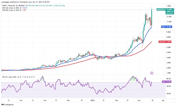 Render (RNDR)修正至 20 日均线,但多头成功守住了支撑位。在这种情况下,这表明市场情绪仍然乐观,投资者正在逢低买入。3 月 17 日,多头将价格推升至 12.78 美元阻力位之上,这可能预示着下一阶段上升趋势的开始。如果买家将价格维持在 12.78 美元以上, RNDR /USDT可能会跃升至 16.81 美元。加密货币疲软的第一个迹象可能是跌破 12 美元的坚实支撑位。突破并收于 20 日均线下方可能会加速抛售,并将该货币对推低至 50 日均线。