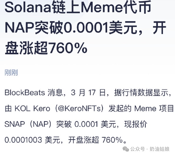 Odaily星球日报讯 由 KOL Kero发起的 Meme 项目 SNAP(NAP)现已在 Raydium 构建流动性池并开放交易,目前报价 0.00003451 美元。Kero 亦于 X 表示,面向参与预售用户的空投正在处理中。此前消息,由 KOL Kero(@KeroNFTs)发起的 Meme 项目 SNAP(NAP)已结束预售。链上数据显示,其地址共计收到约 54696 枚 SOL,价值超 1000 万美元。