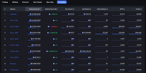 NFTScan 对排名前 1000 的 NFT 持仓价值钱包地址进行了分析,当前持有价值排名前 10 如下图所示: