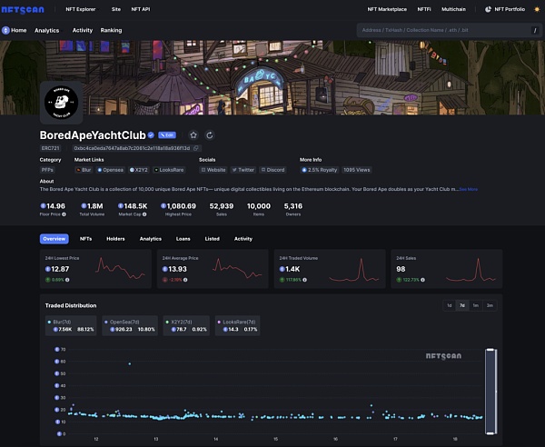 目前 NFTScan 数据显示,BAYC NFT 目前地板价回升稳定在 14.73 ETH,最高成交价 1080.69 ETH,7d 交易额为 8.5k ETH 左右,目前以太坊上总交易额已超 1.8M ETH,过去 7 天交易分布主要为 Blur: 7.56k(88.12%),Opensea: 926.23(10.80%),X2Y2: 78.7(0.92%),LooksRare: 14.3(0.17%)单位 ETH,7d 交易笔数达 614 次。