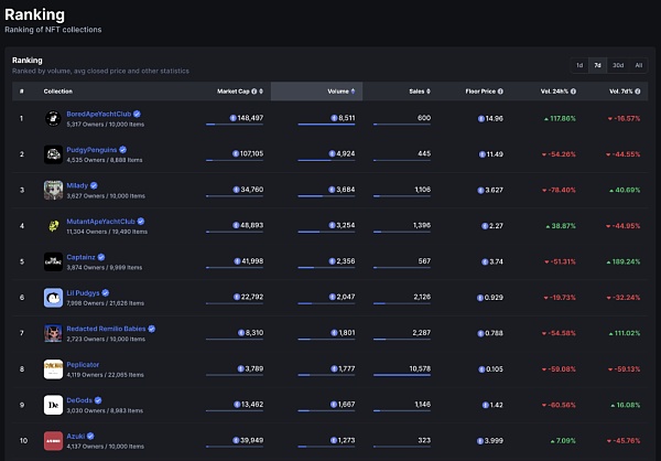 本周 BoredApeYachtClub 位列第一,地板价已跌至 14.96e 左右,7d 交易额达 8,511e; Pudgy Penguins 以 4,924e 的交易额位列第二,目前地板价为 11.49e;Milady 以 3,684e 总交易额位列第四,目前地板价为 3.627e; 大部分蓝筹 NFT 整体市场交易额和地板价呈下跌趋势。