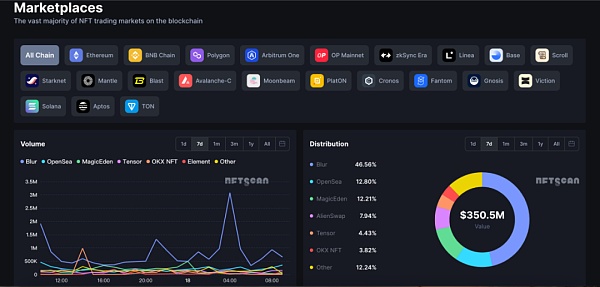 本周:大部分交易市场走势波动较为明显,Blur 占市场主导,整体交易额在 3 月 18 日达到最高,4:00 时 Blur 市场最高达 3080 万美元,NFTScan 收录 222 个交易市场 7d 总交易额达 $350.5m。本周 Blur 交易额排名第一,市场交易额分布较稳定,排名前六的交易市场及占比分布: