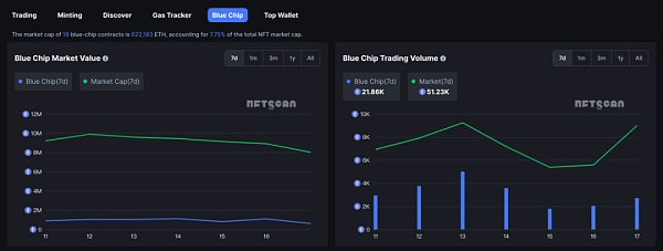 当前 19 只蓝筹合约总市值为 622,183 ETH,占 NFT 总市值的 7.75%。