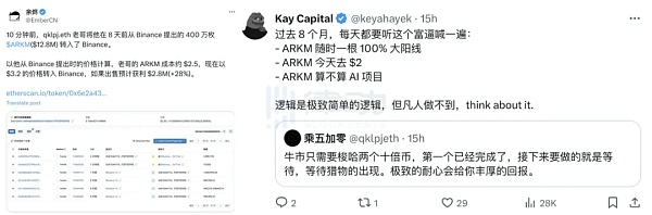 根据社区讨论,qklpj.eth在过去八个月中一直持有ARKM,并在2023年11月以每枚0.386美元的价格将总值316万美元的1009万枚ARKM转入Binance。而上周末,ARKM的最高价达到了3.9美元。