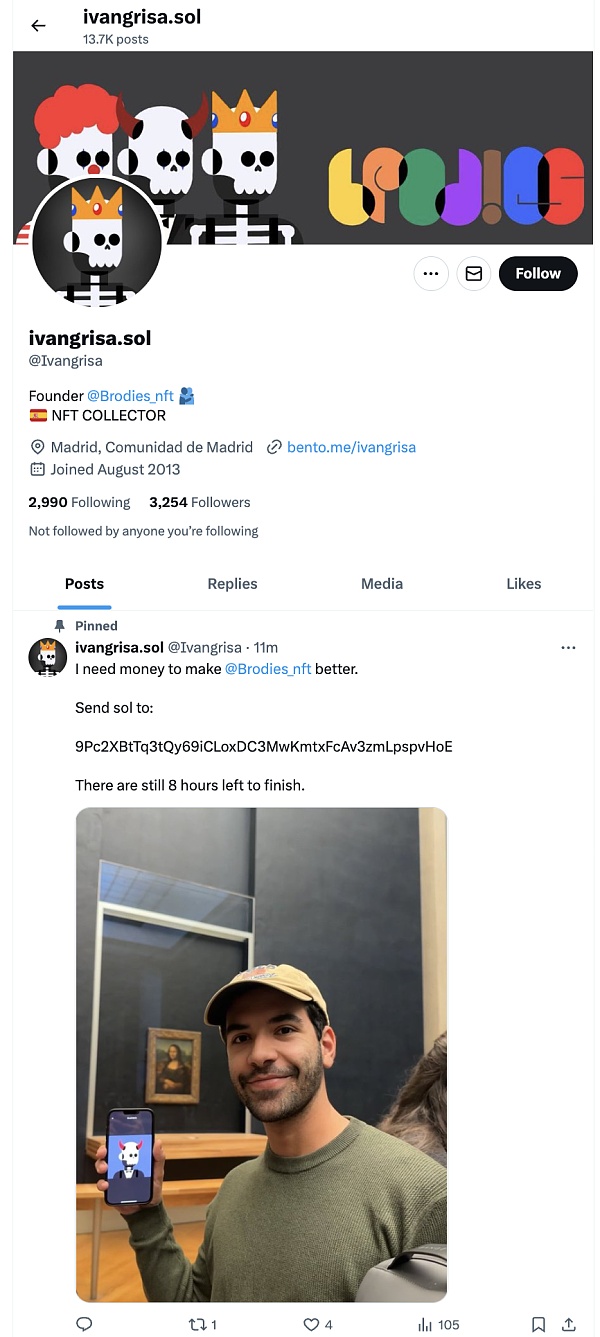 ivangrisa是一位西班牙艺术家,很年轻。也是Solana生态的布道者,认识很多solana上的影响力人物。一直在认真做事。不仅实名露脸,还给自己的NFT项目注册了商标品牌,可谓行业一股清流。