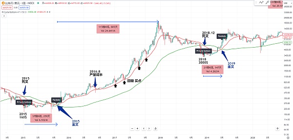 重点是我们可以留意一下2019年的picycle指标 2018年的12月份 红色的这条线死叉这条绿色的线 3000美元在2018年就是当时比特币非常重要的底部 而且我们可以观察一下2015年这个picycle指标