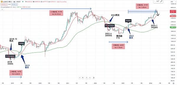 如果没有这个事件 我相信在这个位置就是非常重要的底部 黄金交叉到现在 我们可以观察一下 其实目前谈到牛市结束 我认为还是为时尚早 因为我们可以同样观察历史上只要这个picycle指标黄金交叉 2019年的这个位置黄金交叉 到最终比特币涨到了69000顶部的时间是在900天左右