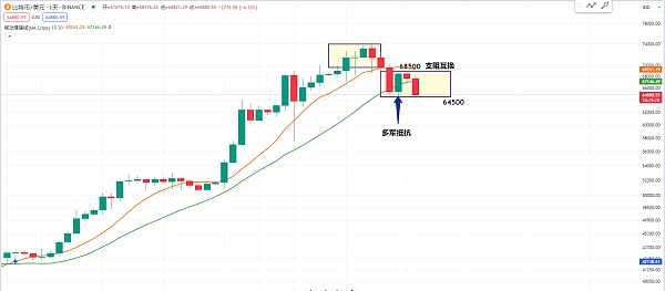 然后我们再来看一下比特币的日线 因为昨天在这个位置我在视频里面是有给大家讲到 大约在68500附近有一个非常重要的支撑和压力转换的位置 那我们尽量留意一下 其实在这个位置还是存在着一个非常重要的多军抵抗的K线