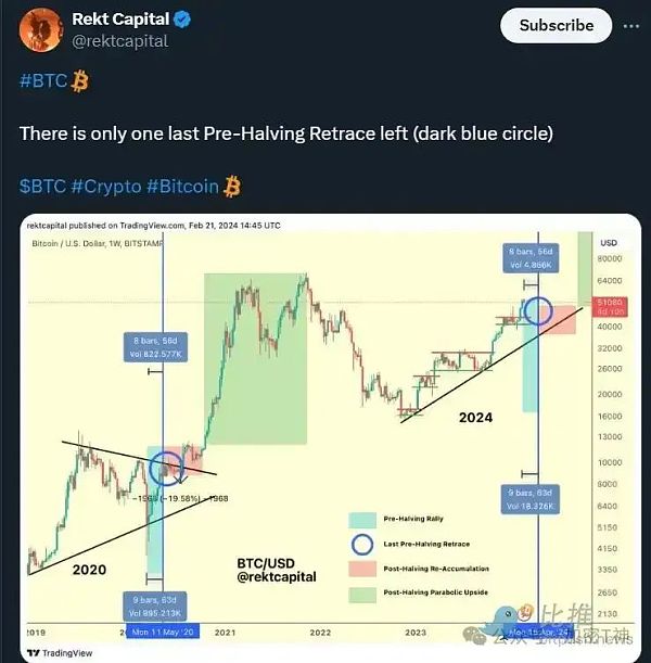 加密货币交易员和独立分析师Rekt Capital在社媒体上表示,持续的价格走势是减半前回调的一部分。在2016年和2020年的减半周期中,比特币的价格分别下跌了38%和20%。