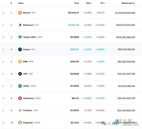 比特币小幅反弹至6.7万-6.8万美元附近,跌幅超过8%。以太坊一度跌破3500美元,最终恢复至3500美元以上,24小时跌幅近3%。在前10名山寨币中,仅Solana(SOL)和Avalanche(AVAX)实现了正收益,狗狗币跌幅最大为6%,BNB、ADA等跌幅在3%左右。