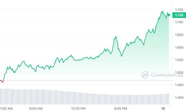 此外,分配模型将 50% 用于生态系统开发,其余部分分配给早期贡献者和社区。随着 Sui 的采用率不断增长,这为 Sui 的升值前景带来了积极的前景。此外,截至发稿时,Sui 股价为 1.72 美元,盘中涨幅为 17.09%。