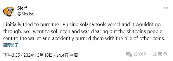 dev推特账号@lerfsol 发文表示,自己因误操作,销毁了 LP 和空投预留代币,铸币权也已经撤销,SLERF代币无法分发给投资者,他无能为力。
