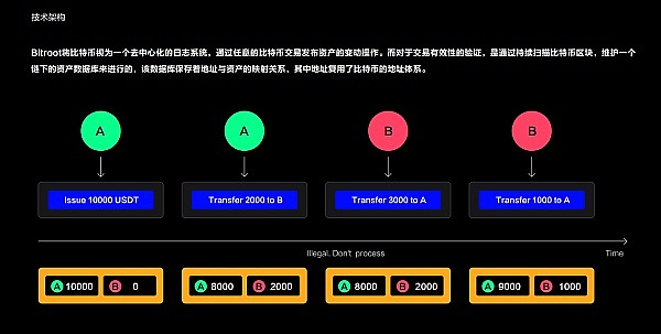 Bitroot将比特币视为一个去中心化的日志系统,通过任意的比特币交易发布资产的变动操作。而对于交易有效性的验证,是通过持续扫描比特币区块,维护一个 链下的资产数据库来进行的,该数据库保存