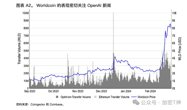 例如,2023 年 12 月 13 日发布的 World ID 2.0 升级版几乎没有引起人们的注意;但在 Sam Altman 于 12 月 15 日推广 Worldcoin 后,WLD 价格却上涨了 50%;而 OpenAI 于 2024 年 2 月 15 日发布的 Sora 更是导致了价格上涨了近三倍。