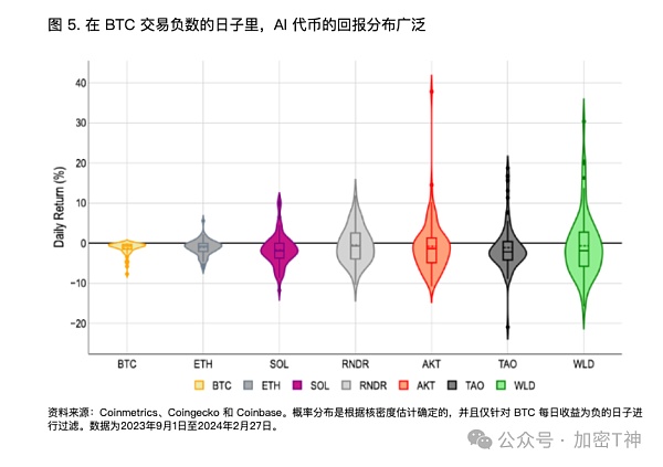 于是我们就能看到最近时常发生的一种现象 ---- 即使比特币价格下跌,以人工智能为中心的代币也可能会经历价格上涨波动,这会导致比特币下跌期间出现上行波动。
