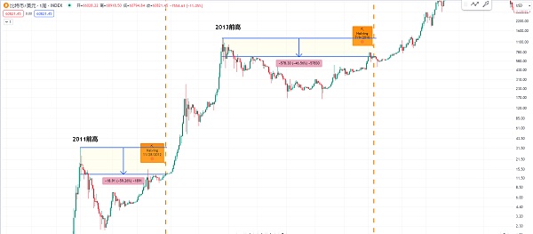 然后我们可以同样观察一下比特币在2016年7月份这里产量减半 当时这个位置的价格距离之前2013年的新高 从高点下来到产量减半当时周线收盘的价格 他的空间是接近47% 或者我们可以观察一下比特币在2012年11月份这里产量减半 他距离之前2011年的这个历史新高 空间是接近60%
