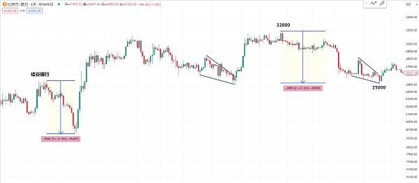那我们可以观察一下比特币在前面几波上涨后的回撤 之前我也有讲到过 他这一波牛市每一次的回撤一般都是在20%左右 就是这个32000的高点到25000的低点 回撤也是20%左右 甚至当时在硅谷银行倒闭的这个位置 回撤的空间也是接近了20%