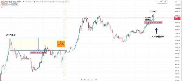 那我们就要判断在产量减半之前或者是距离历史新高 因为现在的73000是目前的历史新高 那我们从历史上比特币产量减半之前距离前高的价格一般空间会有多少的差距