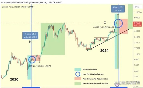 在比特币减半前约60 天,都会发生减半前反弹走势。本轮减半前也出现了反弹,而且比预期的还要早几天。目前,比特币正从减半前反弹阶段过渡到减半前回调阶段。