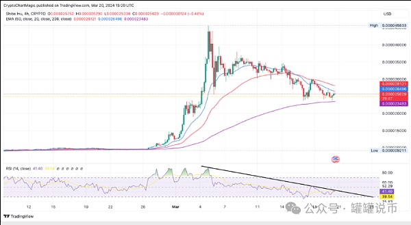 SHIB 必须坚守在 200 日均线支撑之上,否则,明显受损的技术结构可能会恶化,最终导致更多损失。