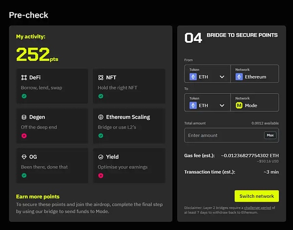 2、桥接资产,用户需要从其他网络桥接资产激活积分,并且需要 ETH 作为空投活动的 gas 费。桥接资产可使用官方桥也可以使用第三方桥,使用官方桥只能从主网桥接资产会产生较高的 gas 费,且提款时有七天资产体现等待期,也可以选择 MiniBridge(https://minibridge.chaineye.tools/)等第三方跨链桥,就能从其他二层桥接资产到 Mode,产生比较少的桥接费用。