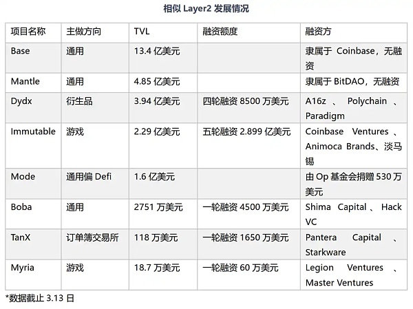 此前,一些 Layer2 项目也推出了 Layer3 项目,例如 Arbitrum 的 Xai。这些 Layer3 主要旨在提供更便宜的 gas 费和更高的吞吐量,针对的是具有高交互特性的游戏赛道。尽管与 Layer2 相比,它们的应用价值有所逊色,但作为发展方向来说,其上限并不低。