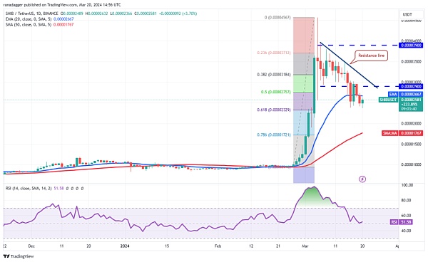 SHIB/USDT 货币对于 3 月 20 日跌至 61.8% 斐波那契回撤位 0.000023 美元,这是最后的支撑堡垒。如果该水平破裂,该货币对可能会暴跌至 50 日移动平均线(0.000017 美元)。跌幅越深,新一轮上涨开始所需的时间就越长。
