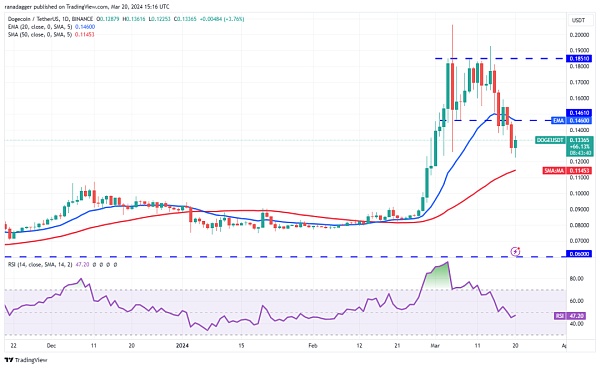 3 月 19 日抛售仍在继续,DOGE/USDT 货币对于 3 月 20 日暴跌至 0.12 美元的强支撑位。预计买家将守住 50 日移动平均线(0.11 美元),但他们可能会发现很难将价格推升至 0.16 美元上方。