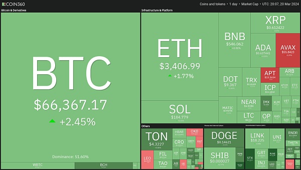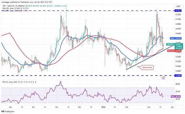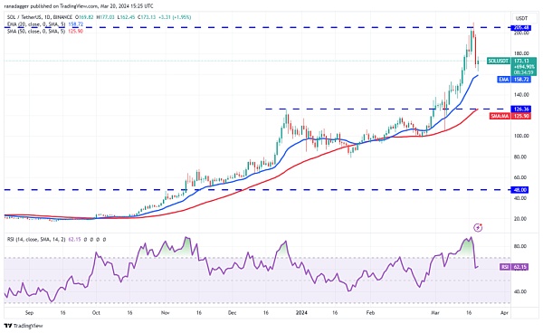 SOL/USDT 货币对于 3 月 20 日跌至 20 日均线(158 美元),这是值得关注的重要支撑位。如果价格从 20 日均线强势反弹,则表明市场情绪依然乐观。多头将再次尝试将价格推高至 205 美元上方阻力位。