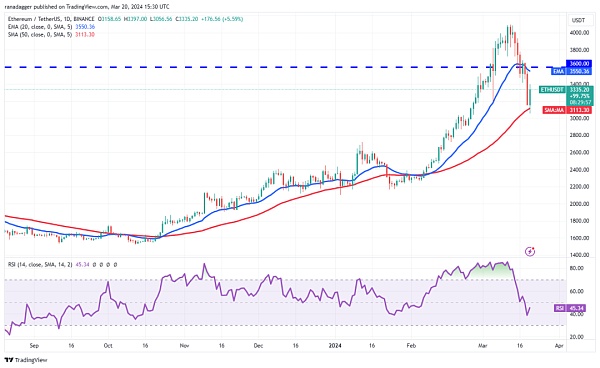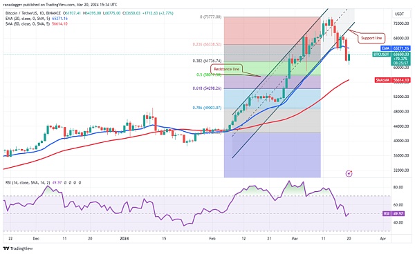 3 月 18 日,比特币从上升通道的支撑线回落,表明空头正试图将该水平转变为阻力位。这加剧了抛售,并将价格拉至 3 月 19 日跌破 20 天指数移动平均线(65,271 美元)。
