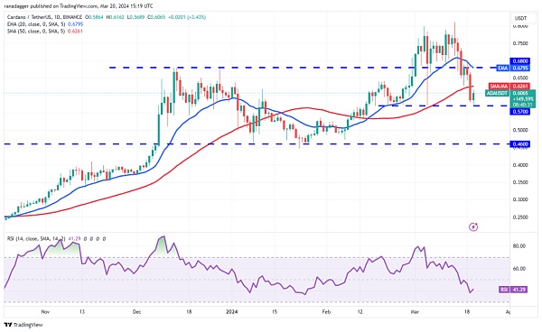 ADA/USDT 货币对试图在 0.57 美元处寻求支撑,但复苏尝试可能会面临移动平均线的抛售。如果价格从移动平均线转向下跌,将增加跌破 0.57 美元的可能性。随后该货币对可能会滑至 0.53 美元。