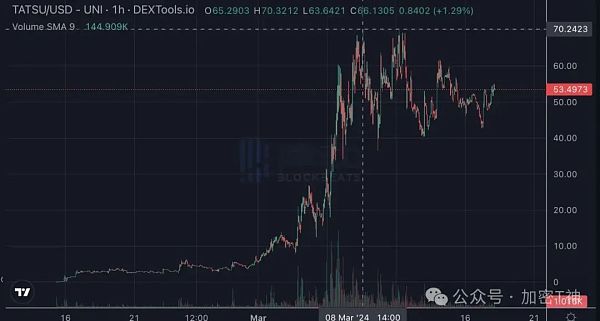Taτsu代币$TATSU在今日内经历了惊人的涨幅。它从上线时的0.2美元,到发布第一条推文时的0.3美元,再到发布产品页面时的10美元,涨幅达到了50倍而在3月初,随着推出产品“AI对话助手TaτsuASK”,TATSU的美元在3月8日突破了70美元,用了15天时间完成了从3美元到70美元的35倍惊人增幅。