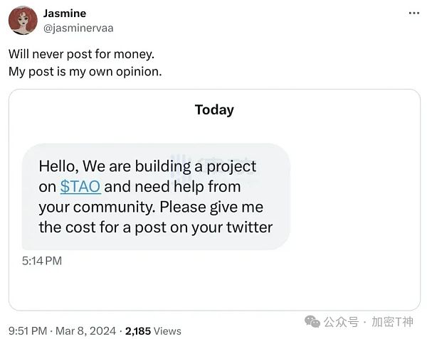 TBANK上线两天后,以“Bittensor上的试验性代币标准”为定位的道会计系统代币TAS也上线了。与前两个项目相比,“试验性代币标准”并没有产品图可发布,上线后的两天,TAS经历了大涨大跌。在这段时间里,有人在项目方的评论区对“团队如约取消交易税”提出了质疑,而团队则只是发了一条推文表示“将在参加完成ETH Denver回来后上线测试网”。在该推文的评论区里,KOL发出的合作邀请占了一大半。不到4天的时间,TAS的代币涨幅超过了8倍。