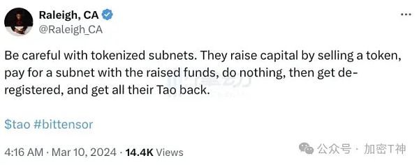 如果这些项目都是土狗托盘,那么对于投资者来说,定位宏大、潜力无限的Bittensor可能只能被视为AI meme领域的龙头项目,其下的分支项目则改为炒作性质的“meme”然而,与普通的 meme 项目不同,当 Bittensor 热度高时,“别沾 Bittensor”可能是更为稳定的选择。很多人已经意识到了这一点,他们显然表示“小心代币”化子网”。