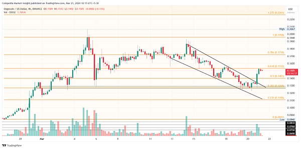 在 4 小时图中,DOGE 价格显示出下降通道,随着买家的回归,未能维持下降趋势。随着看涨突破,狗狗币价格正在挑战 61.80% 斐波那契水平,并预示着牛市将突破该水平。