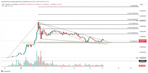 经过近 45% 的调整,SHIB 价格从 0.00004567 美元的峰值跌至 0.00002451 美元大关,导致下降通道。此外,模因币与当前的上升趋势形成了看涨旗形图案。