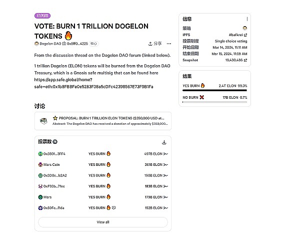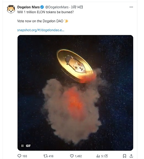 在 3 月 14 日,Dogelon Mars 项目在官方推特上发起了一个投票,该投票关于 1 万亿枚 $ELON 代币的销毁。